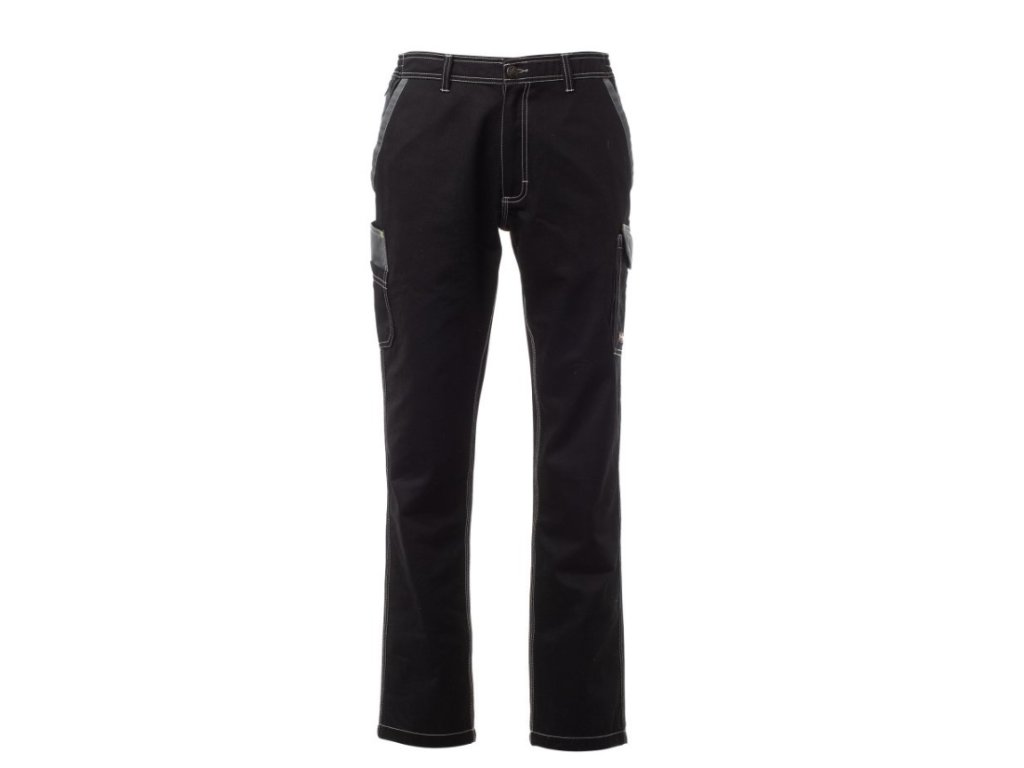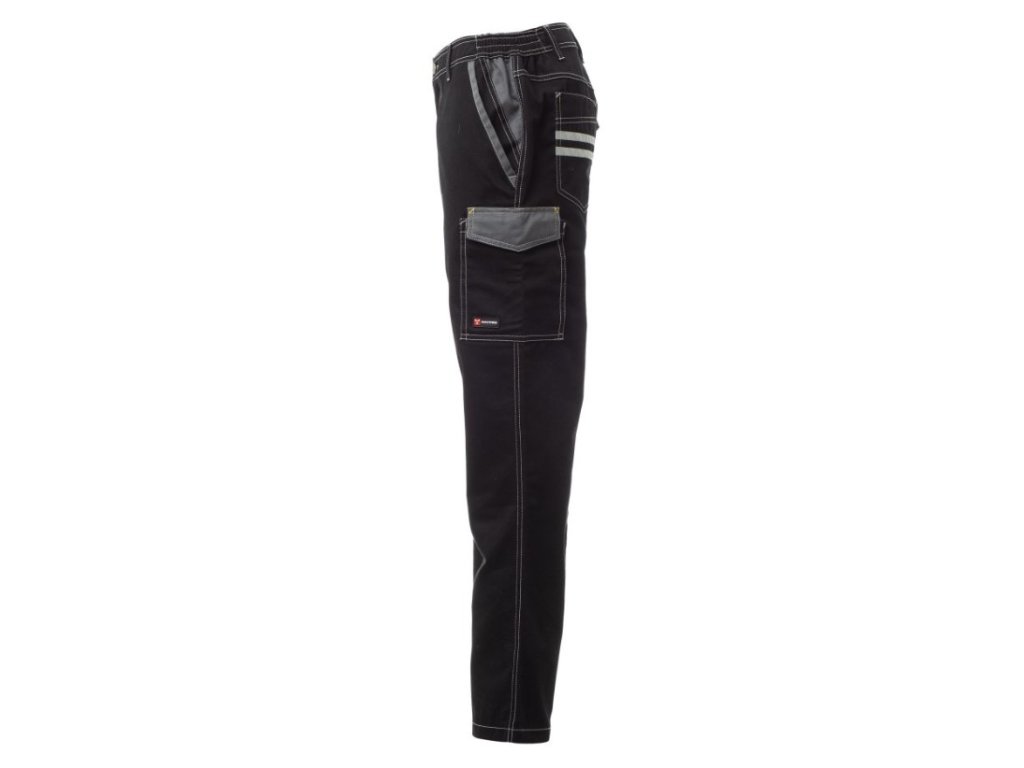 Pánské celoroční pracovní kalhoty. Pohodlné pracovní kalhoty s elastickými pásky na bocích a poutky na opasek. Zapínání na zip a kovový knoflík. Dvě přední kapsy, postranní kapsa LOCK SYSTEM, dvojitá kapsa na metr na levé straně a dvě zadní kapsy – jedna otevřená, druhá se suchým zipem. Kontrastní vsadky a prošití, reflexní pruhy na zadní kapse a zesílené prošití na vnitřní straně nohavic.