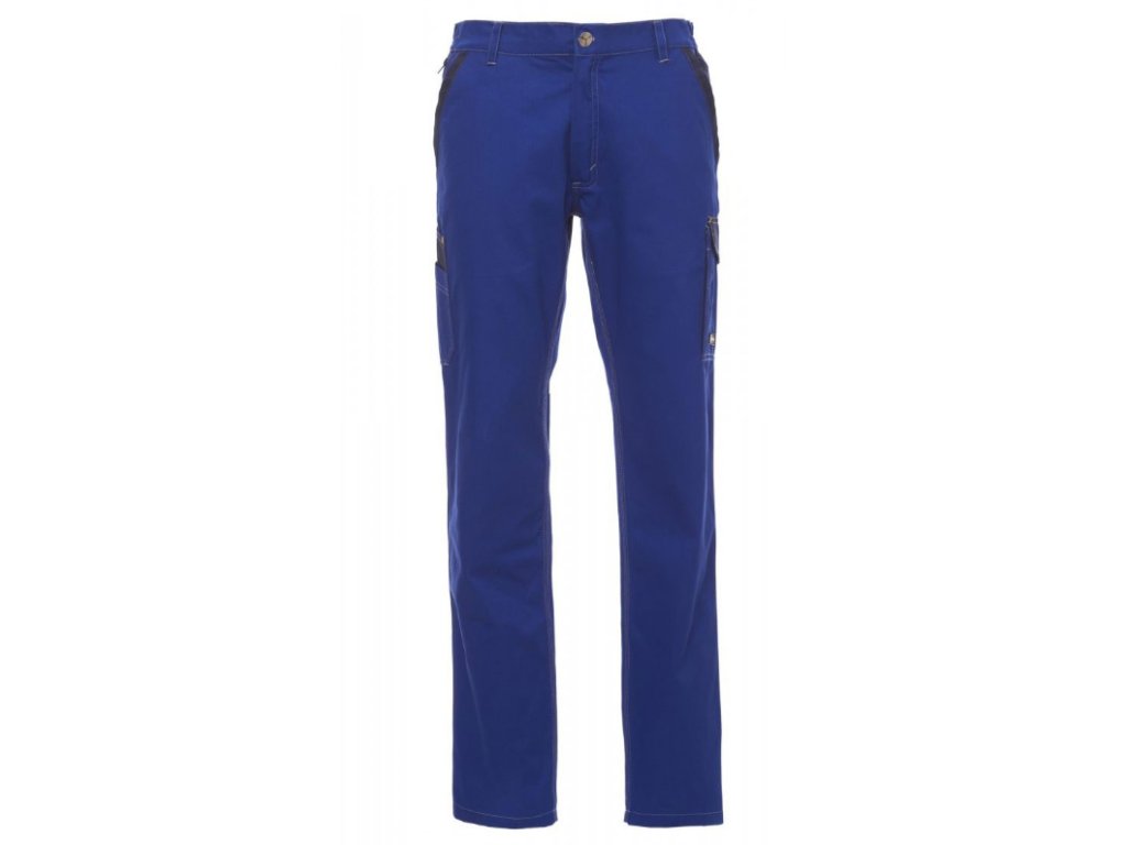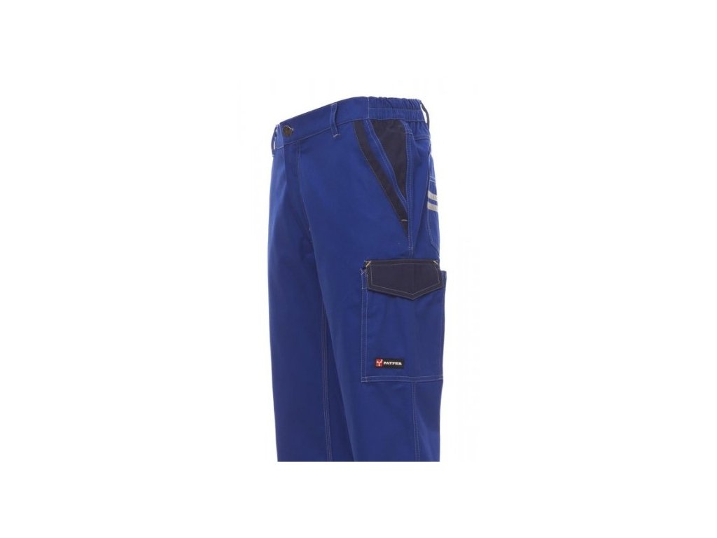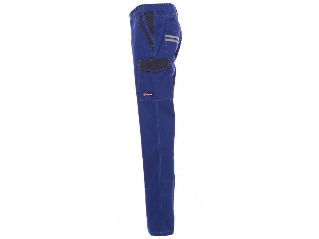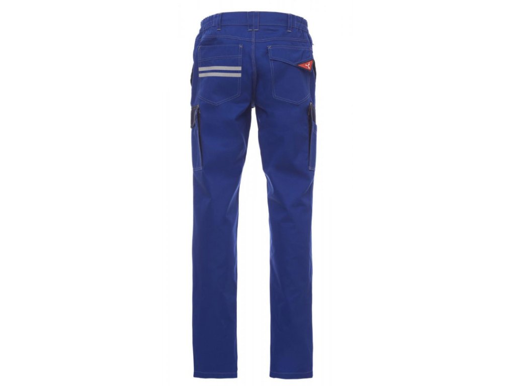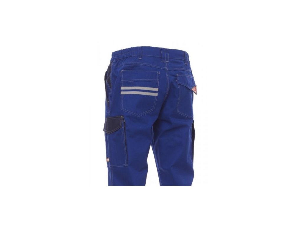 Pánské celoroční pracovní kalhoty. Pohodlné pracovní kalhoty s elastickými pásky na bocích a poutky na opasek. Zapínání na zip a kovový knoflík. Dvě přední kapsy, postranní kapsa LOCK SYSTEM, dvojitá kapsa na metr na levé straně a dvě zadní kapsy – jedna otevřená, druhá se suchým zipem. Kontrastní vsadky a prošití, reflexní pruhy na zadní kapse a zesílené prošití na vnitřní straně nohavic.