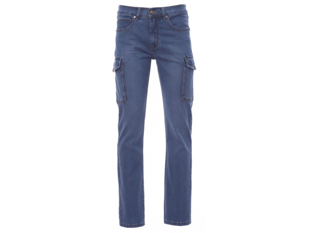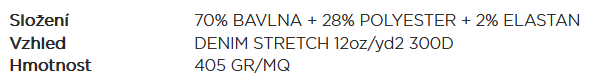 Pánské kalhoty džínového střihu, s pěti kapsami, dvě postranní kapsy LOCK SYSTEM s malým klínkem, zapínání na kovový zip a knoflík, poutka v pase, stone washed, opotřebený a vybledlý efekt, kontrastní odolné prošití, dvojité prošití na vnitřní straně nohavic, rovný střih, cvočky, záplaty z pravé kůže. Hmotnost látky: 12oz/yd².