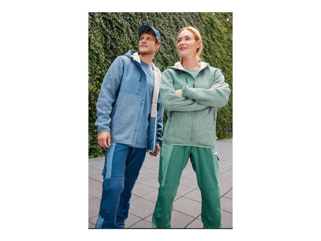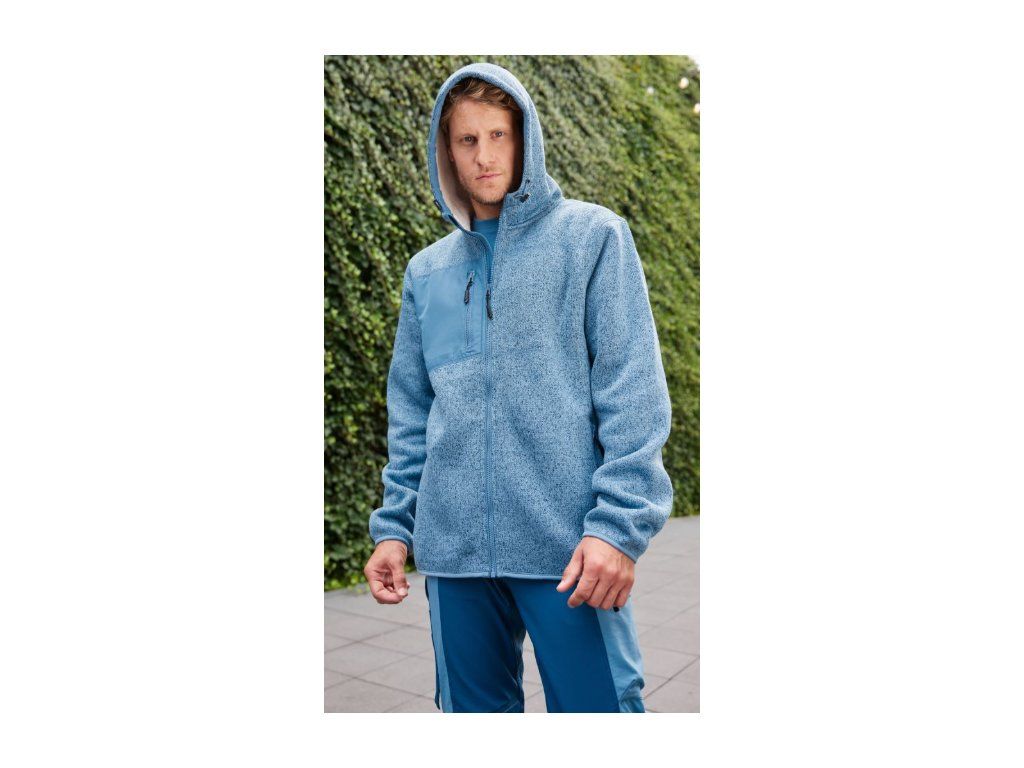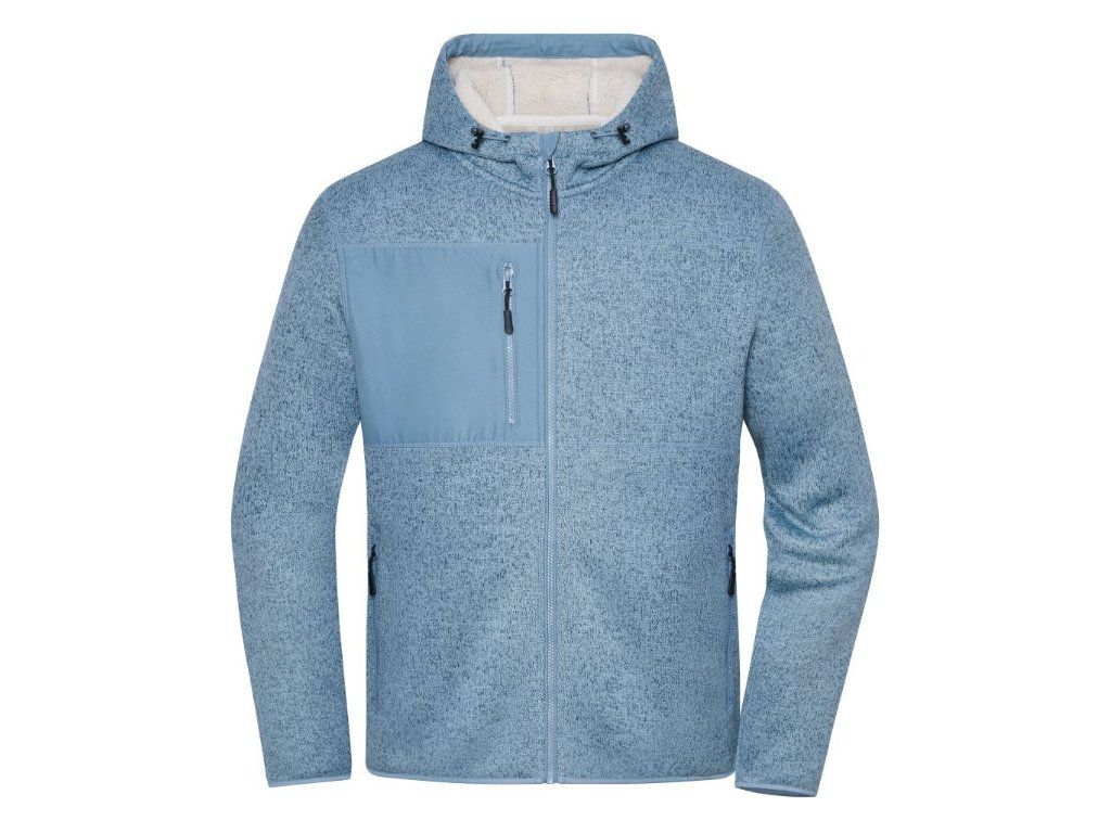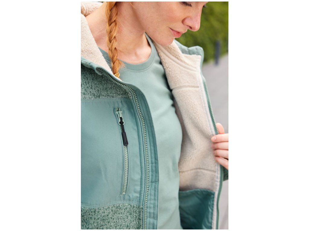 Pletený vzhled z vnější strany, vnitřní strana z materiálu sherpa, 2-vrstvá kapuce se šňůrkou, nastavitelná kapuce, podšitý zip s ochranou brady, YKK zipy, 2 velké vnitřní kapsy, 2 boční kapsy a 1 náprsní kapsa se zipem, melanžový vzhled, pratelné na 30°, nelze sušit v sušičce.